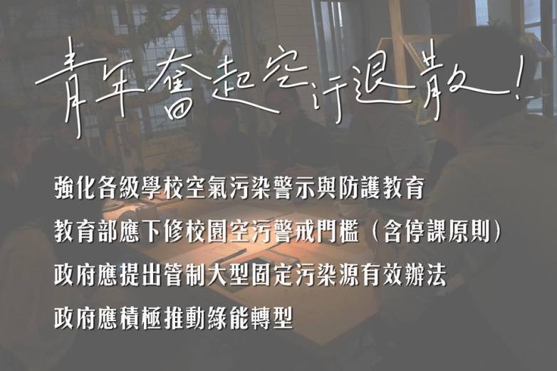 與反空污青年大平台夥伴共同擬定四項訴求,融入校園監測與教育,以融入健康與體育領域課程綱要落實學生的科學學習以及監測數據研讀。透過現有的空氣汙染監測數據分享之網路平台,達到公民科學落實的效果。